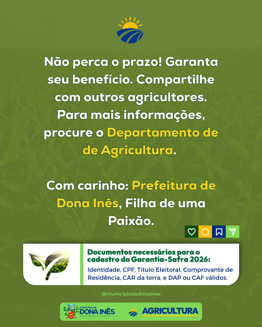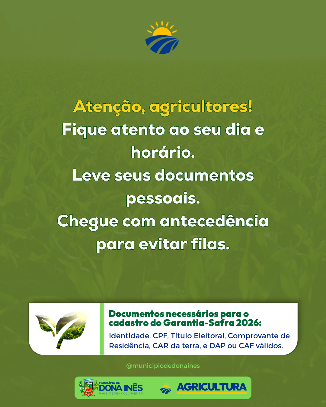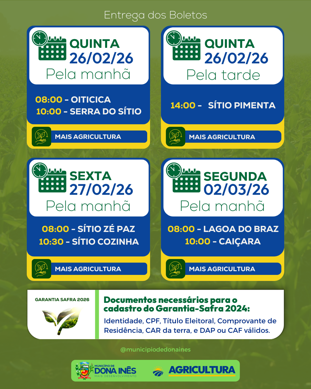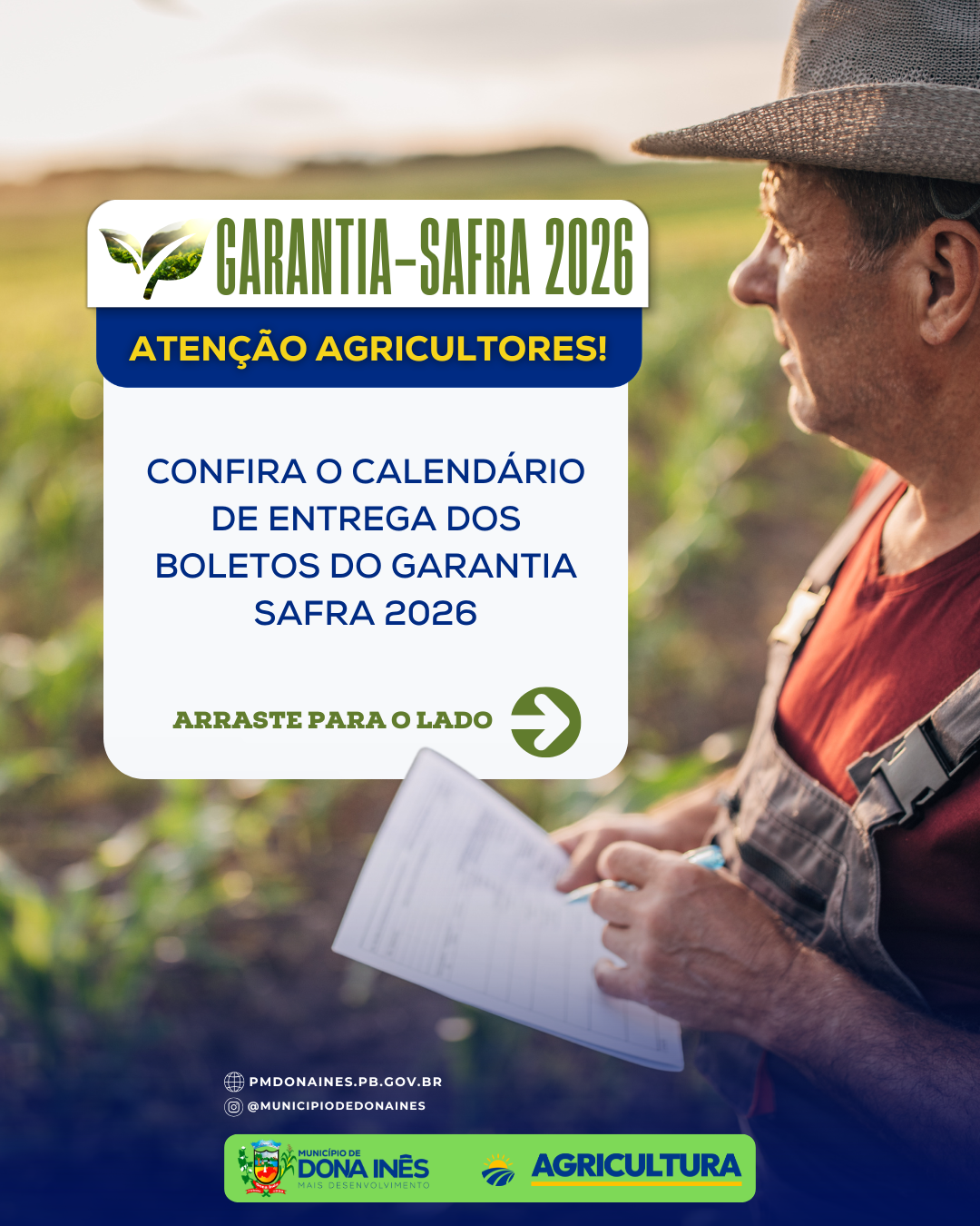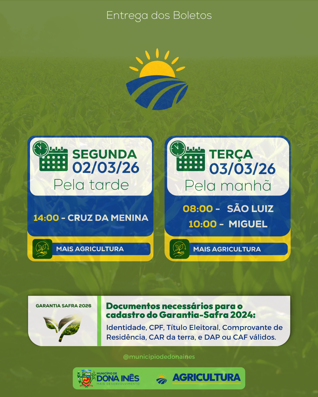 A Prefeitura Municipal, por meio do Departamento de Agricultura, iniciou o calendário de entrega dos boletos do Garantia-Safra 2026. É importante que os beneficiários fiquem atentos às datas, locais e horários para não perder o prazo e garantir o acesso ao benefício. O programa é essencial para apoiar a agricultura familiar em períodos de perdas causadas pela seca ou chuvas intensas, assegurando mais segurança e renda ao homem e à mulher do campo. Uma das datas já acontece nesta semana. Compartilhe a informação com outros agricultores da sua comunidade e, em caso de dúvidas, procure o Departamento de Agricultura. ✅ Prefeitura de Dona Inês — Mais agricultura, mais desenvolvimento.
