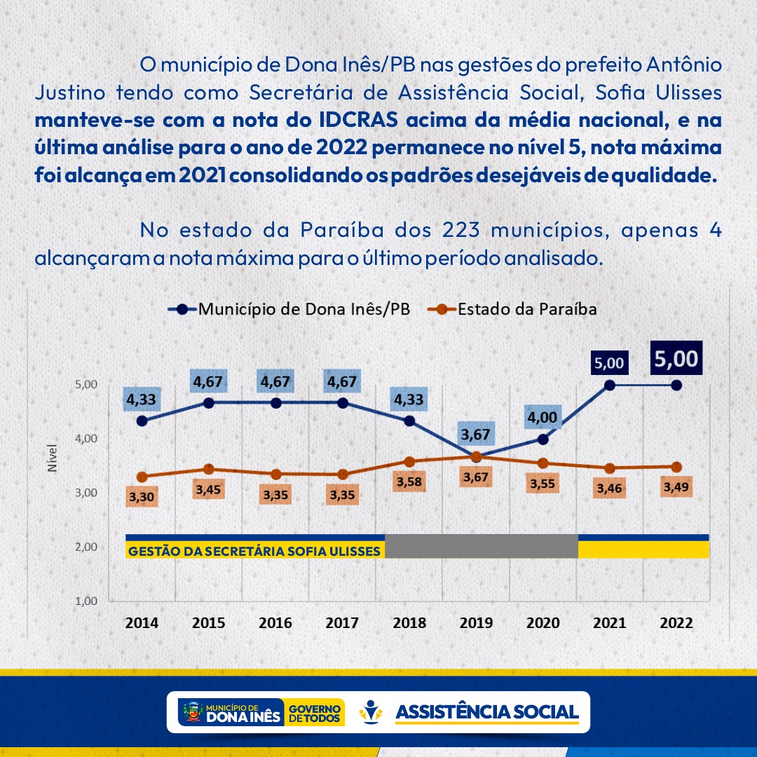 O município de Dona Inês/PB nas gestões do prefeito Antônio Justino tendo como Secretária de Assistência Social, Sofia Ulisses manteve-se com a nota do IDCRAS acima da média nacional, e na última análise para o ano de 2022 permanece no nível 5, nota máxima foi alcança em 2021 consolidando os padrões desejáveis de qualidade. No estado da Paraíba dos 223 municípios, apenas 4 alcançaram a nota máxima para o último período analisado. Já no Brasil dos 5.570 municípios, 235 atingiram o nível de excelência no atendimento à população.