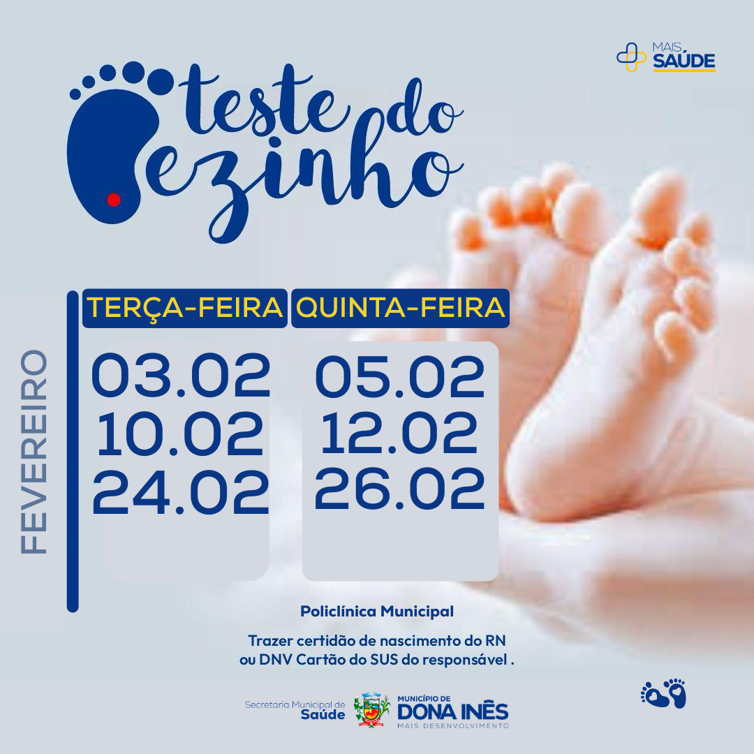 Cuidado desde os primeiros dias de vida. O Teste do Pezinho é essencial para identificar doenças congênitas e garantir o desenvolvimento saudável dos recém-nascidos. A ação será realizada na Policlínica Municipal ao longo do mês. Para o atendimento, é necessário apresentar a certidão de nascimento ou DNV, além do Cartão do SUS do responsável: