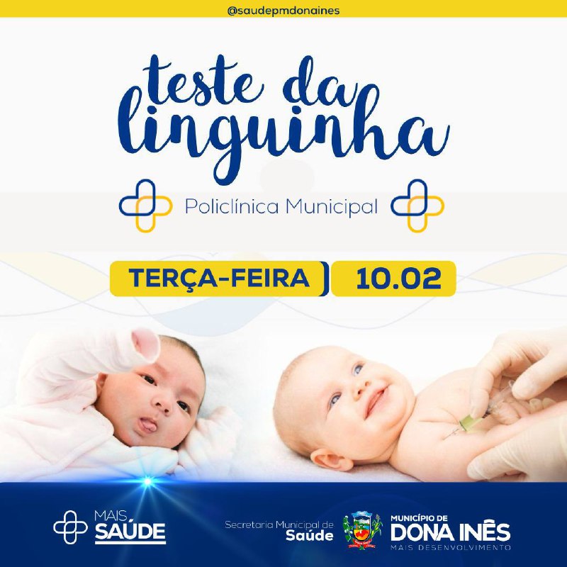 Terça é dia de Teste da Linguinha. No dia 10 de fevereiro, a Policlínica Municipal realizará o Teste da Linguinha, exame importante para avaliar a mobilidade da língua do bebê e identificar possíveis alterações na amamentação e na fala.