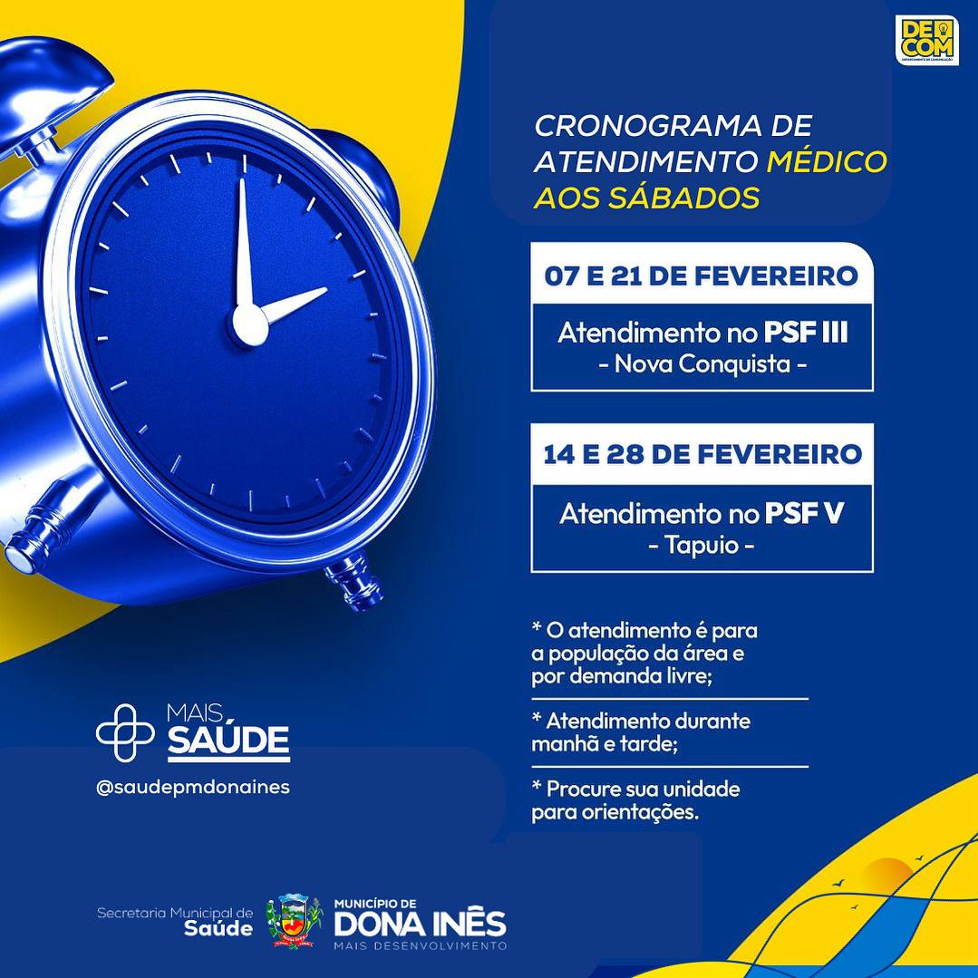 O atendimento é gratuito e rápido. Dona Inês: mais saúde, mais desenvolvimento. Acompanhe os canais oficiais da Prefeitura para ficar por dentro de todas as ações e cronogramas da saúde em fevereiro. Sigam @saudepmdonaines