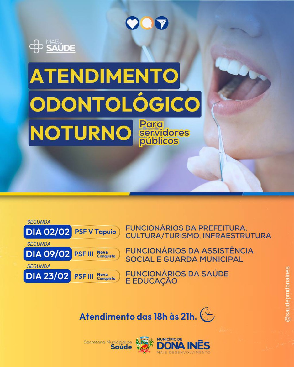 Mais saúde para quem cuida da nossa cidade. Novamente este mês, os servidores municipais terão acesso ao atendimento odontológico noturno. A iniciativa visa facilitar o cuidado com a saúde bucal de quem contribui diariamente com o desenvolvimento da cidade: