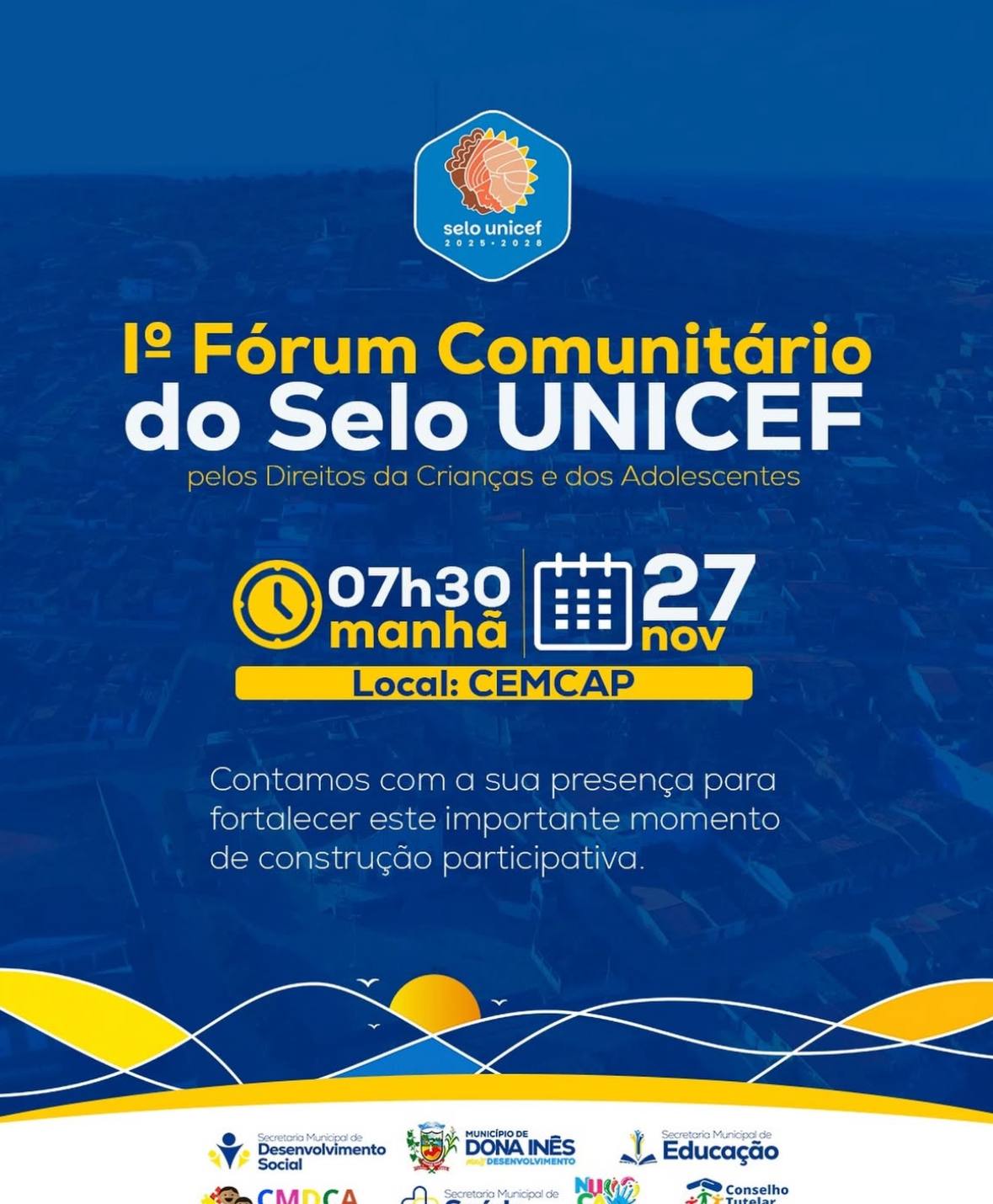 A Prefeitura de Dona Inês, por meio da Comissão Intersetorial do Selo UNICEF, realizará no dia 27 de novembro, a partir das 7h30, no CEMCAP, o 1º Fórum Comunitário do Selo UNICEF. O evento marca um importante passo no fortalecimento das políticas públicas voltadas à infância e à adolescência no município.