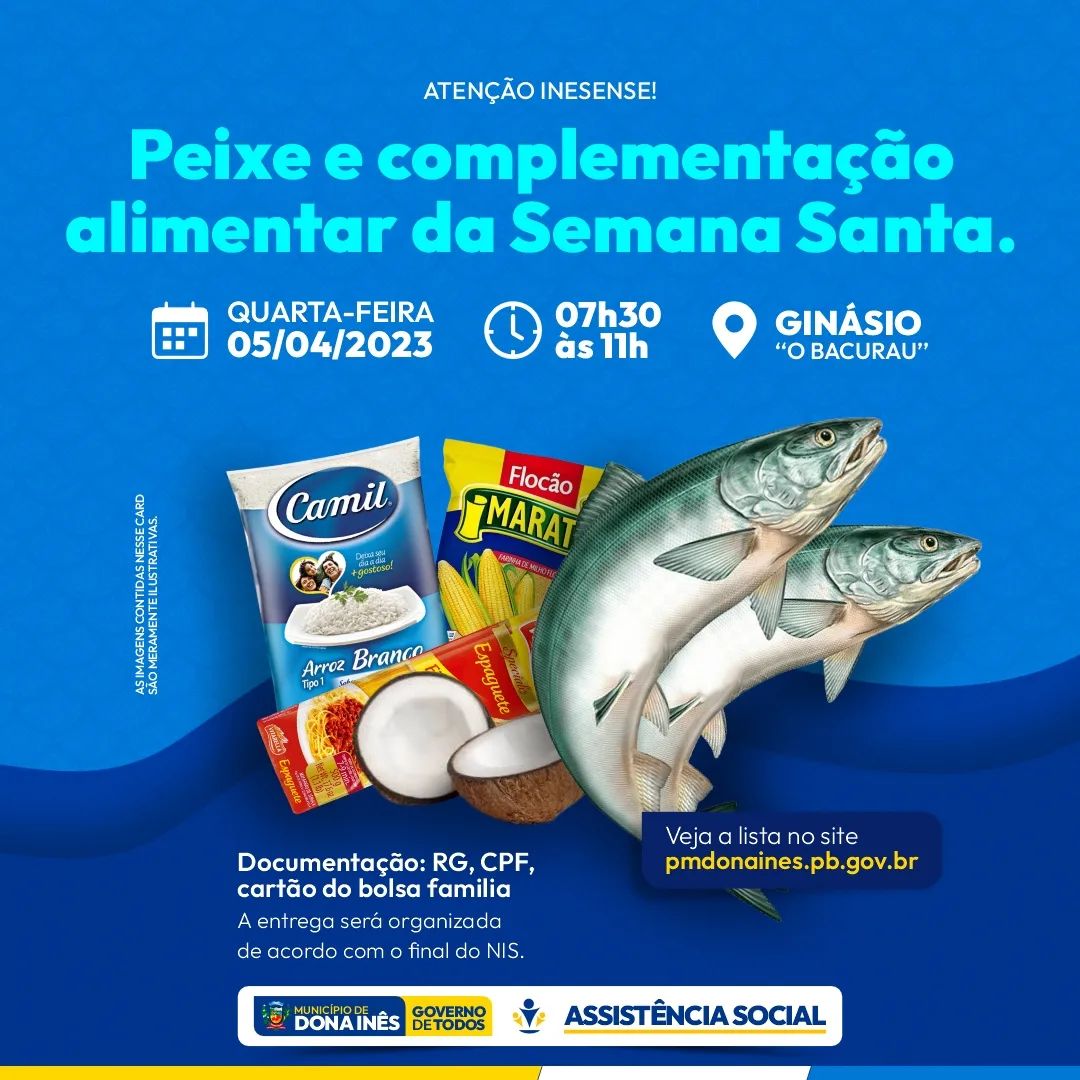 Mantendo a tradição de distribuição de Pescados na semana santa, informamos que será realizada na quarta-feira a entrega do pescado na Semana Santa, na qual contemplará todas as Famílias beneficiárias do Programa Auxílio Brasil (Antigo Bolsa Família).