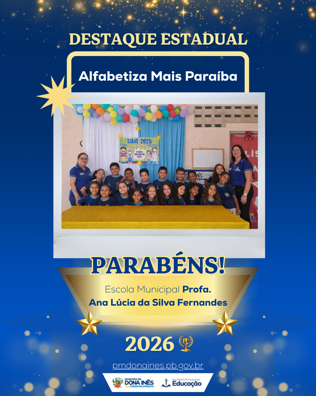 O município de Dona Inês, por meio da Secretaria Municipal de Educação, conquistou importante reconhecimento estadual. A Escola Municipal Professora Ana Lúcia da Silva Fernandes, de Ensino Fundamental, foi destaque no programa Alfabetiza Mais Paraíba, sendo premiada pela excelência na alfabetização de crianças na idade certa.
