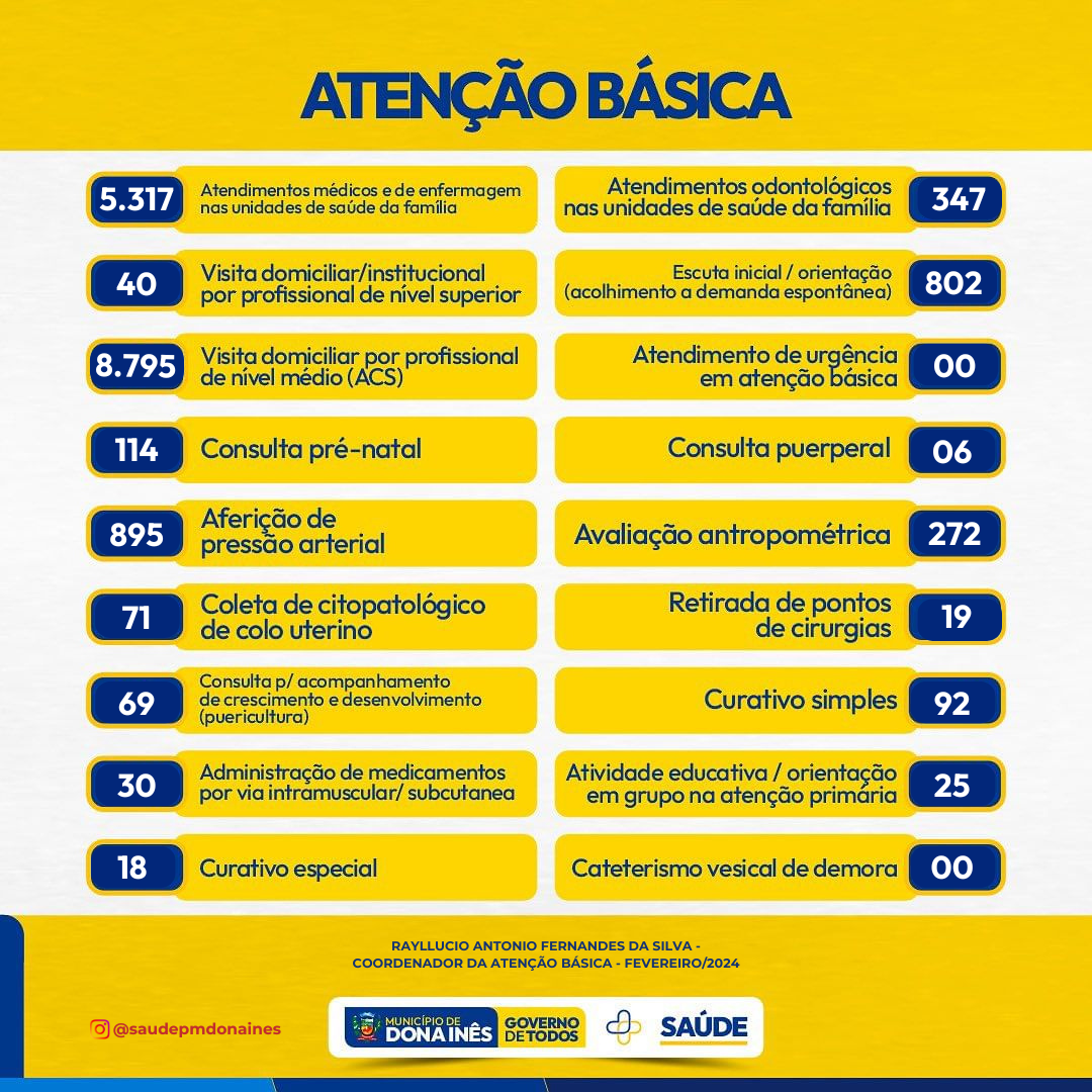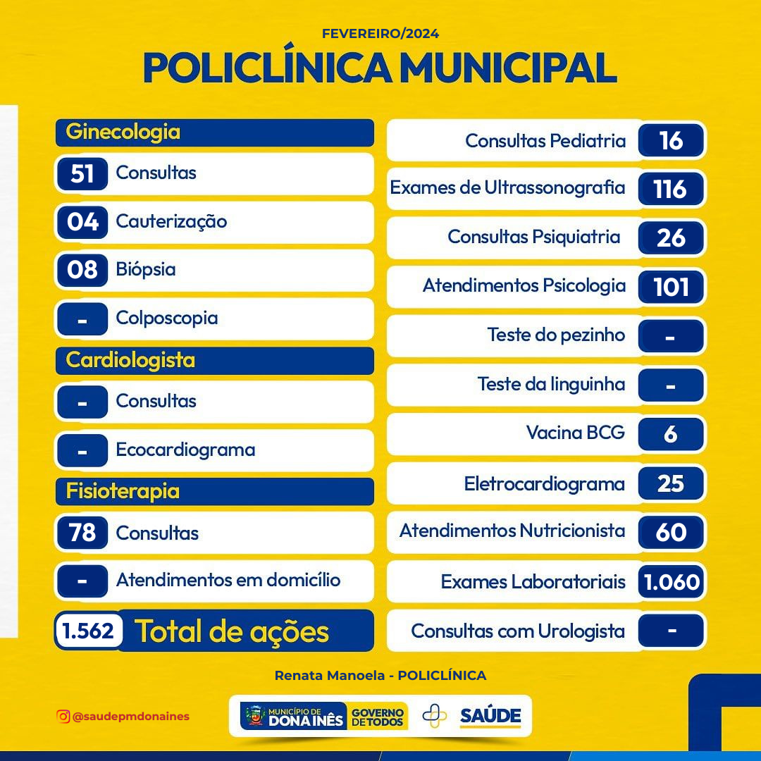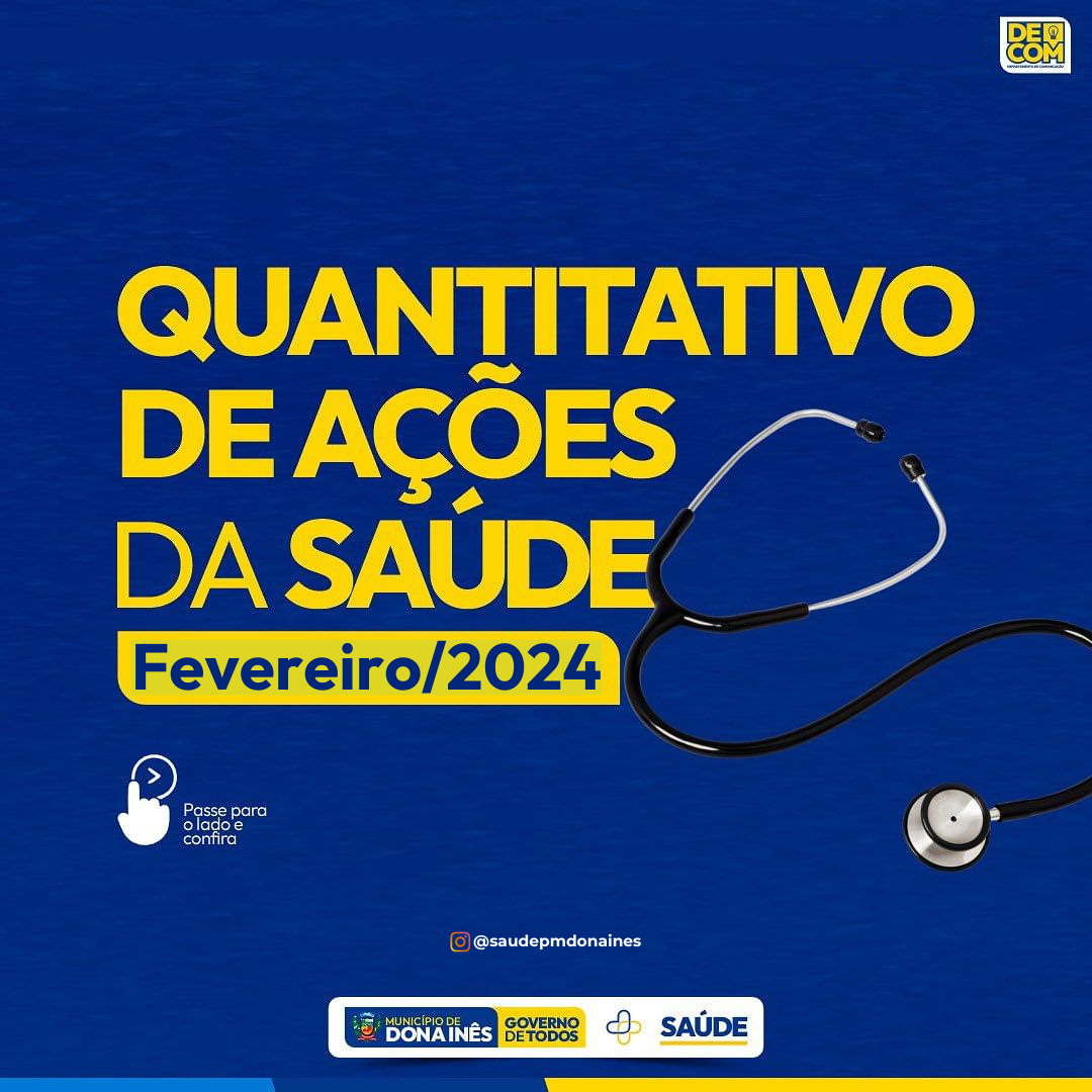 Confira o quantitativo das ações realizadas no mês de fevereiro da Secretaria de Saúde, no Pronto Atendimento Municipal, Atenção Básica, Policlínica, Vigilância em Saúde, Farmácia Básica, Assistência Social – Saúde, bem como o CAPS.