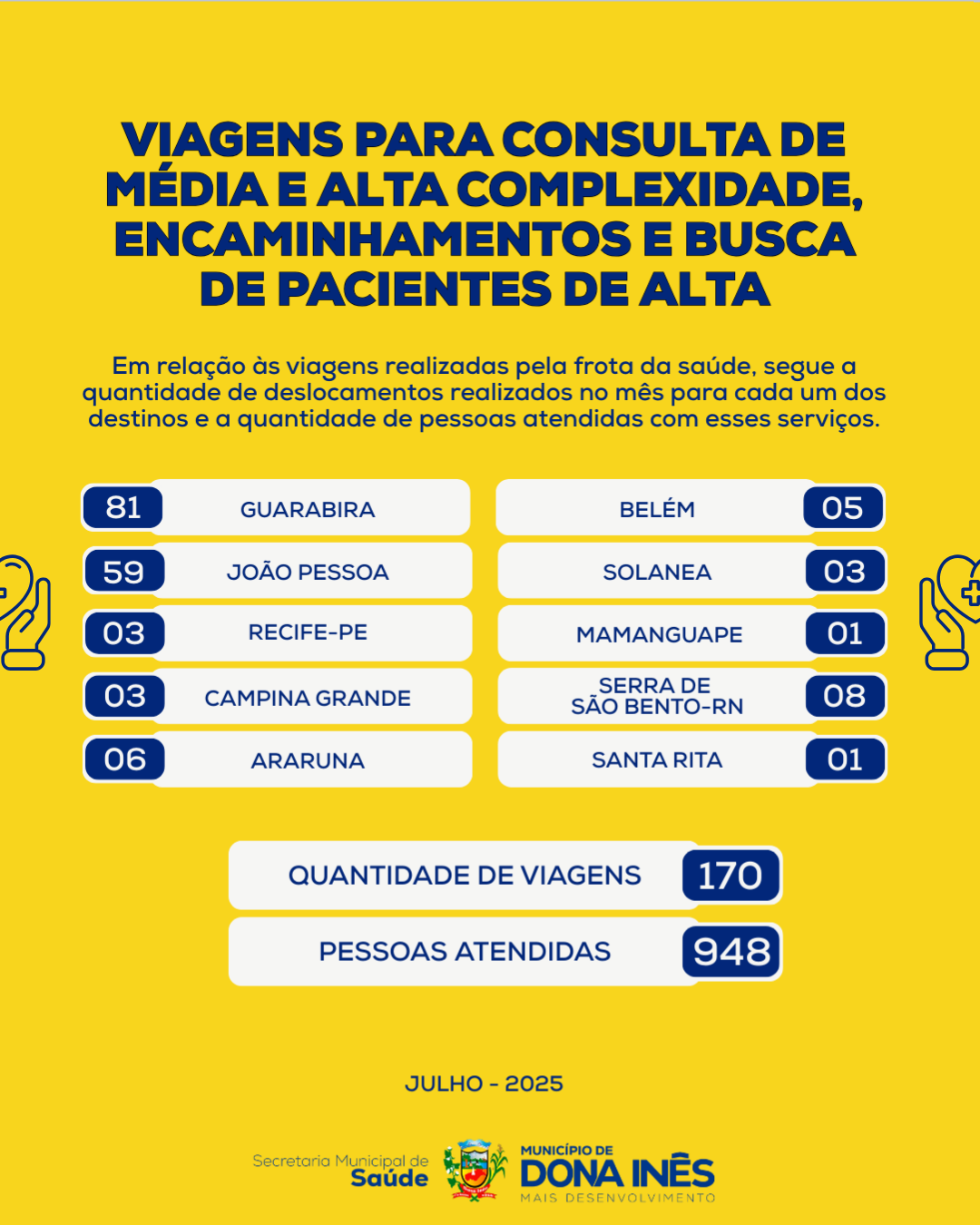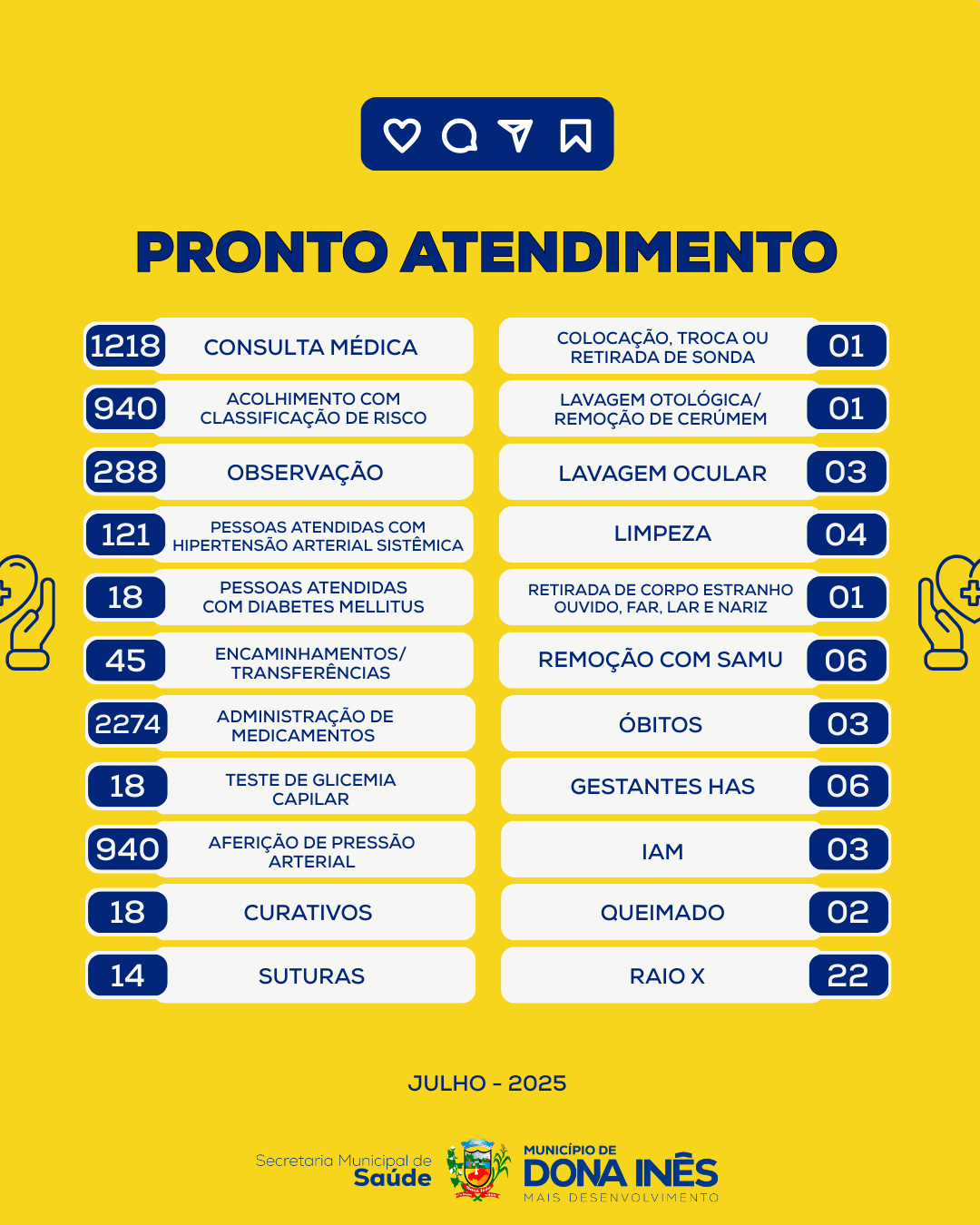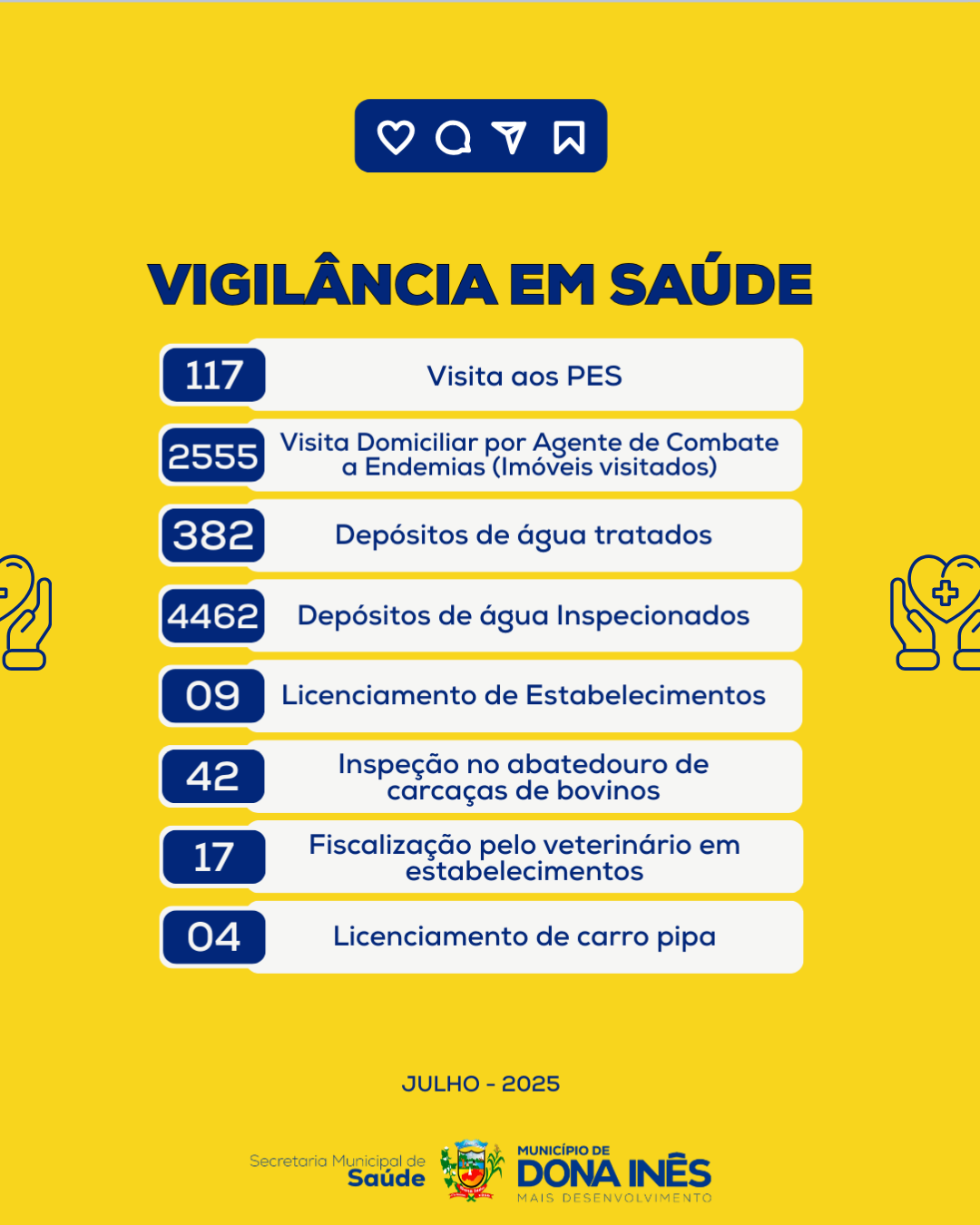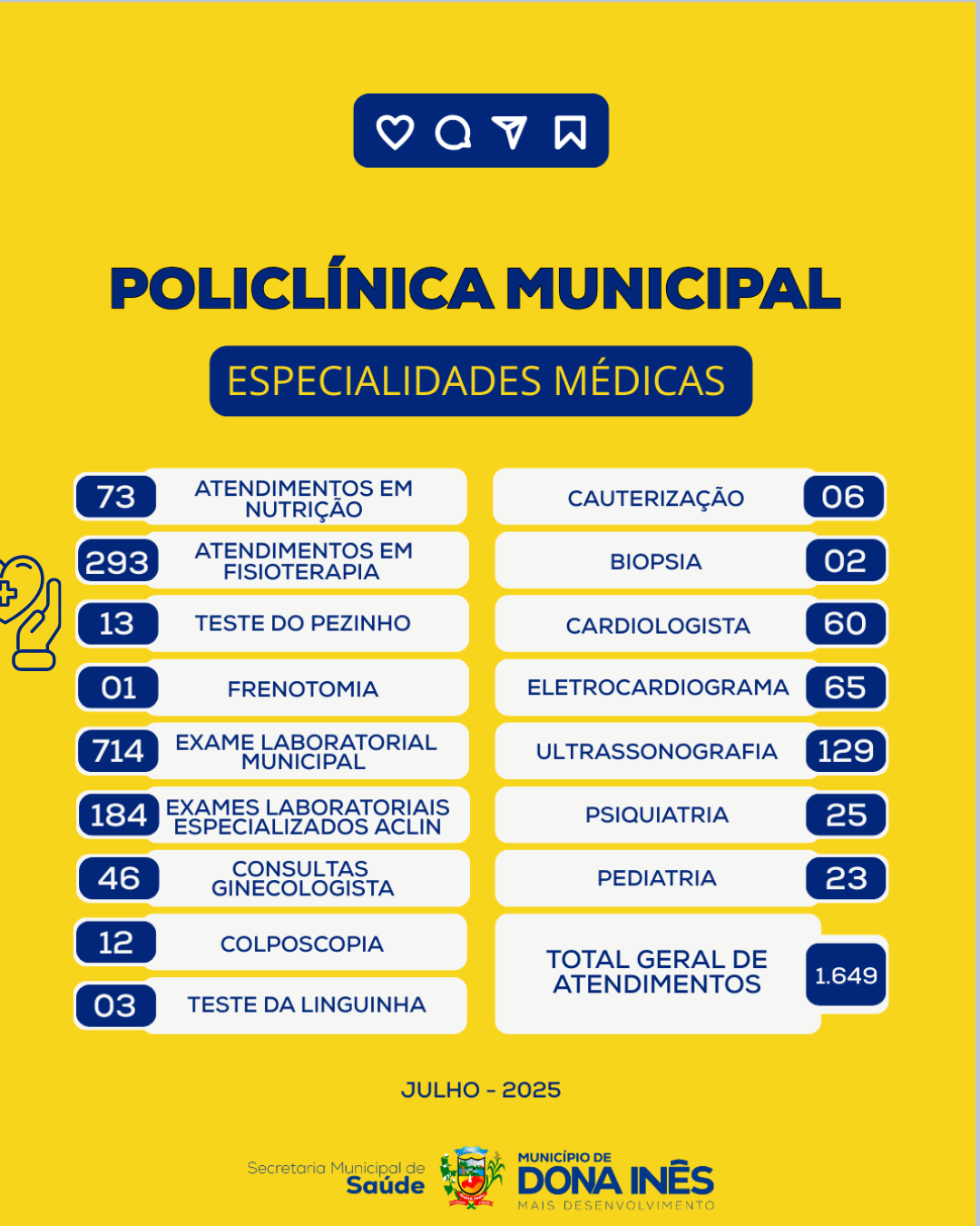 A Secretaria de Saúde de Dona Inês segue comprometida com o bem-estar da nossa população! Confira o quantitativo das ações realizadas em julho de 2025: