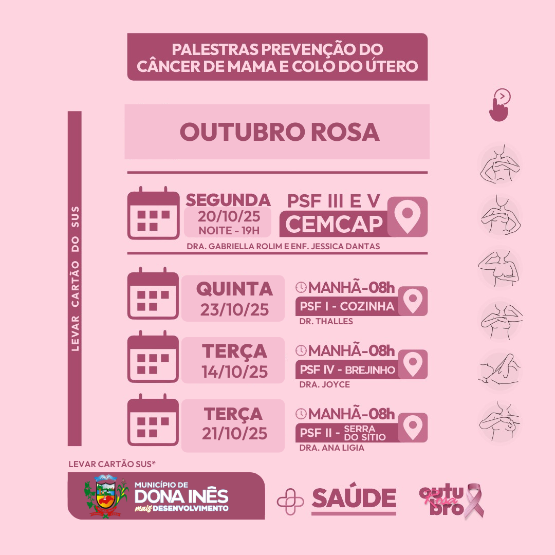 A gestão municipal, por meio da Secretaria de Saúde, realizará diversas ações em alusão ao Outubro Rosa — mês de prevenção e conscientização sobre o câncer de mama.