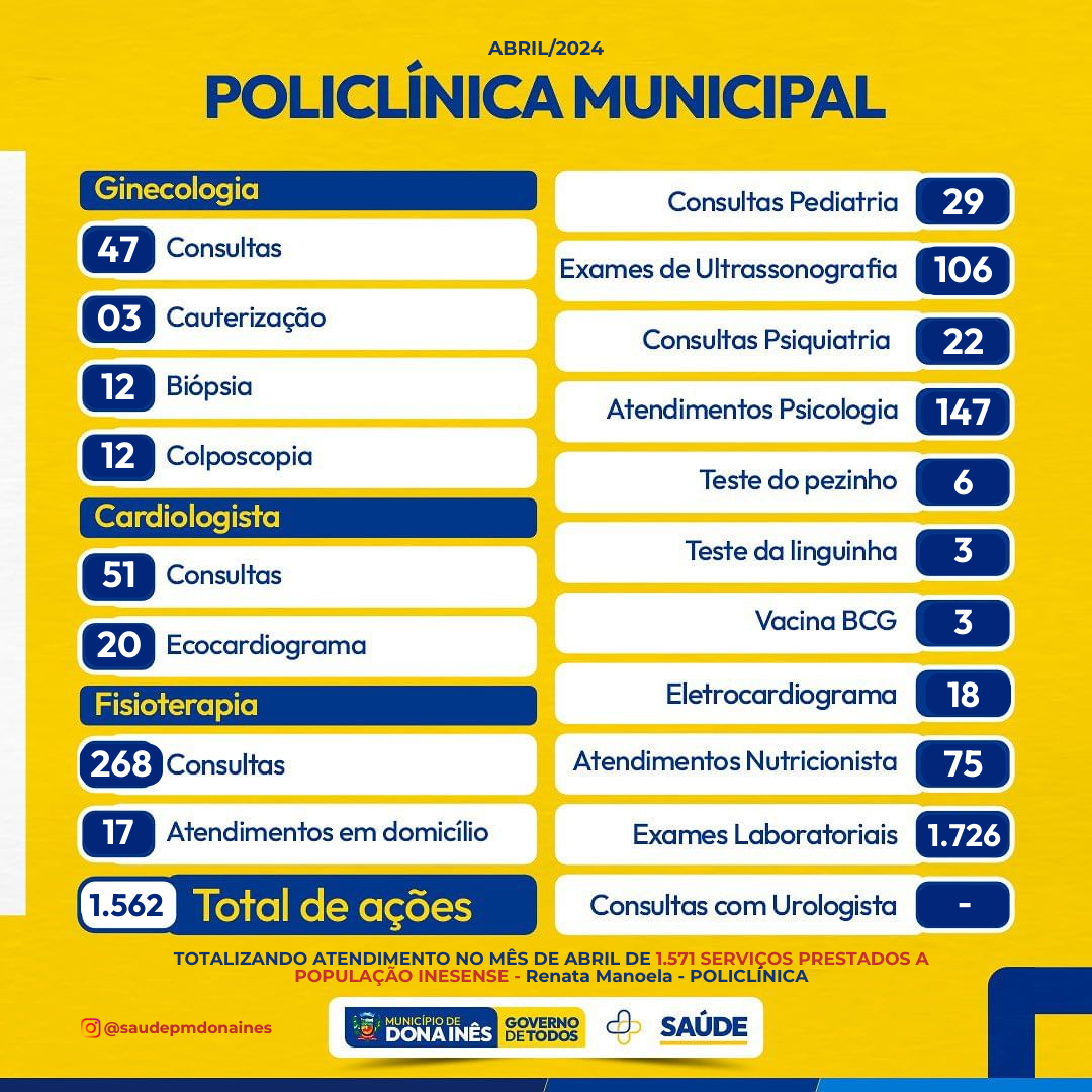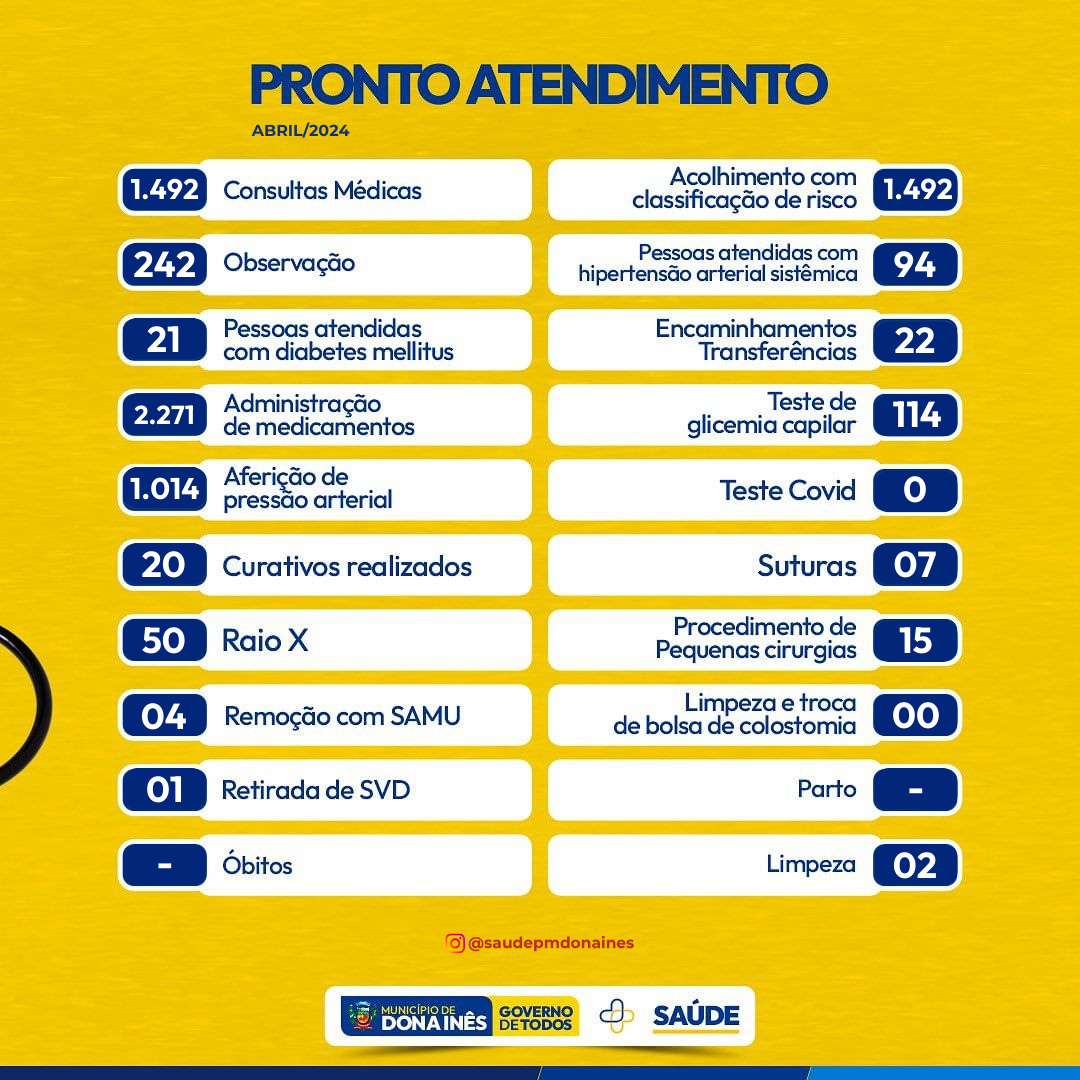 Confira em detalhes o quantitativo das ações realizadas no mês de abril da Secretaria de Saúde, no Pronto Atendimento Municipal, Atenção Básica, Policlínica, Vigilância em Saúde, Farmácia Básica, Assistência Social – saúde, CAPS e SISREG.