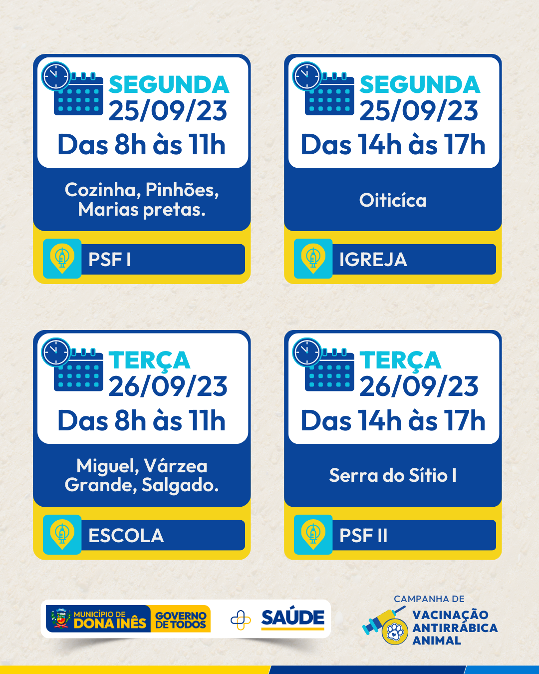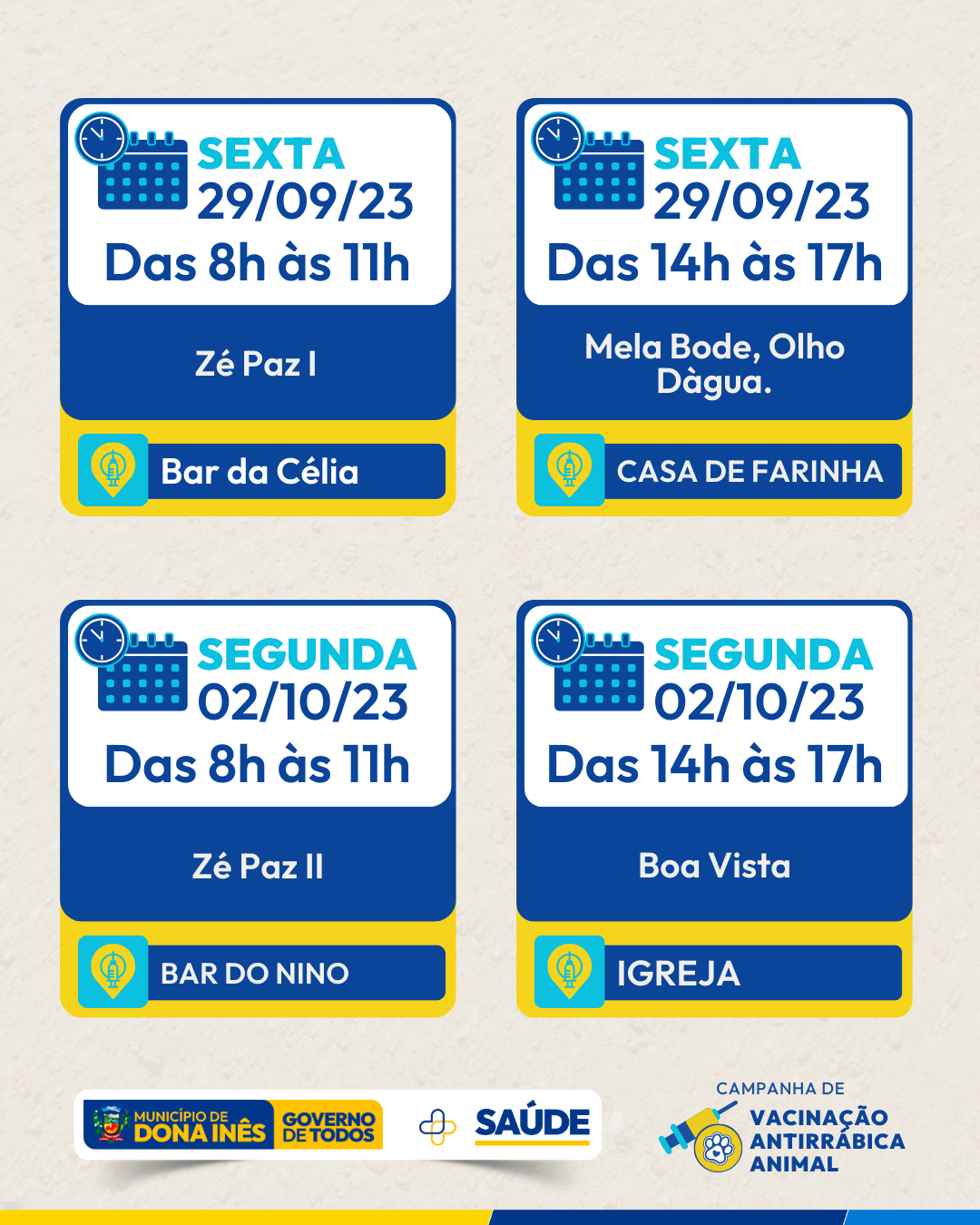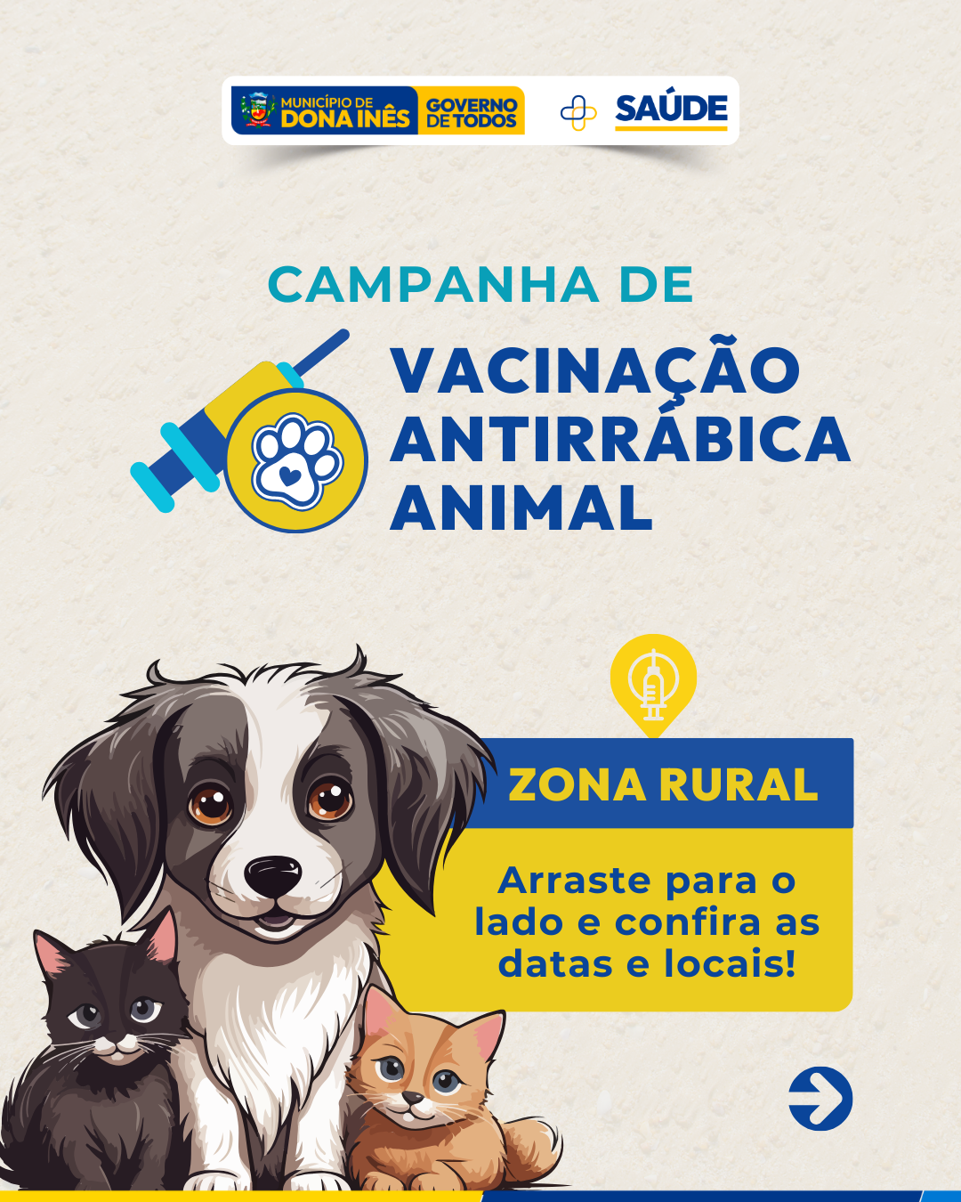 A Gestão Municipal de Dona Inês, através da Secretaria de Saúde, segue com a campanha de vacinação antirrábica. Você da zona rural, confira os locais e horários de vacinação! Todos os cães e gatos devem ser vacinados. Arraste para o lado!