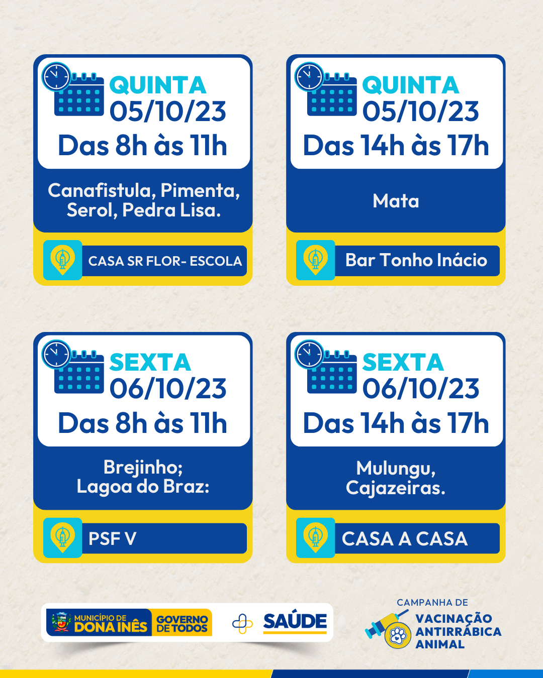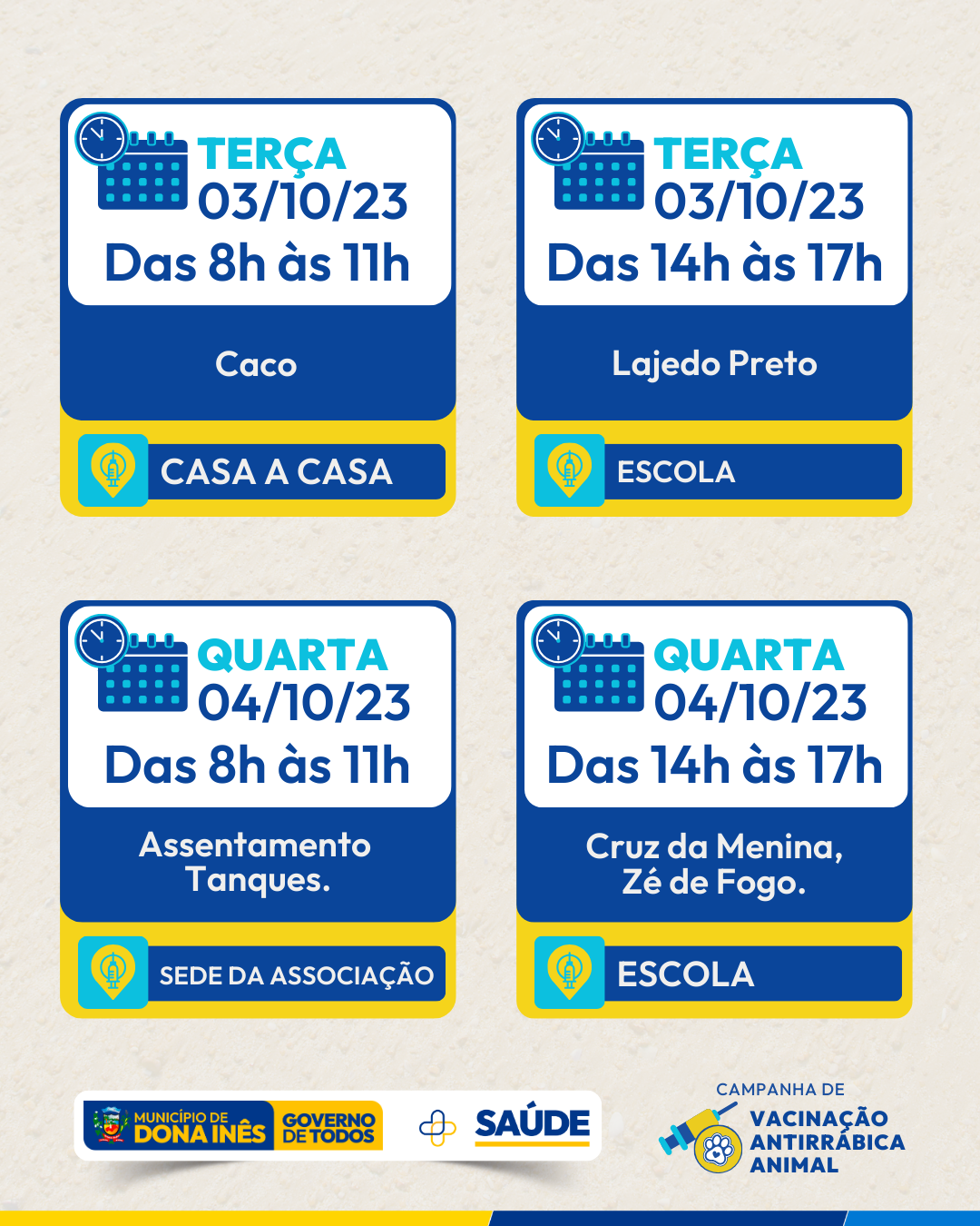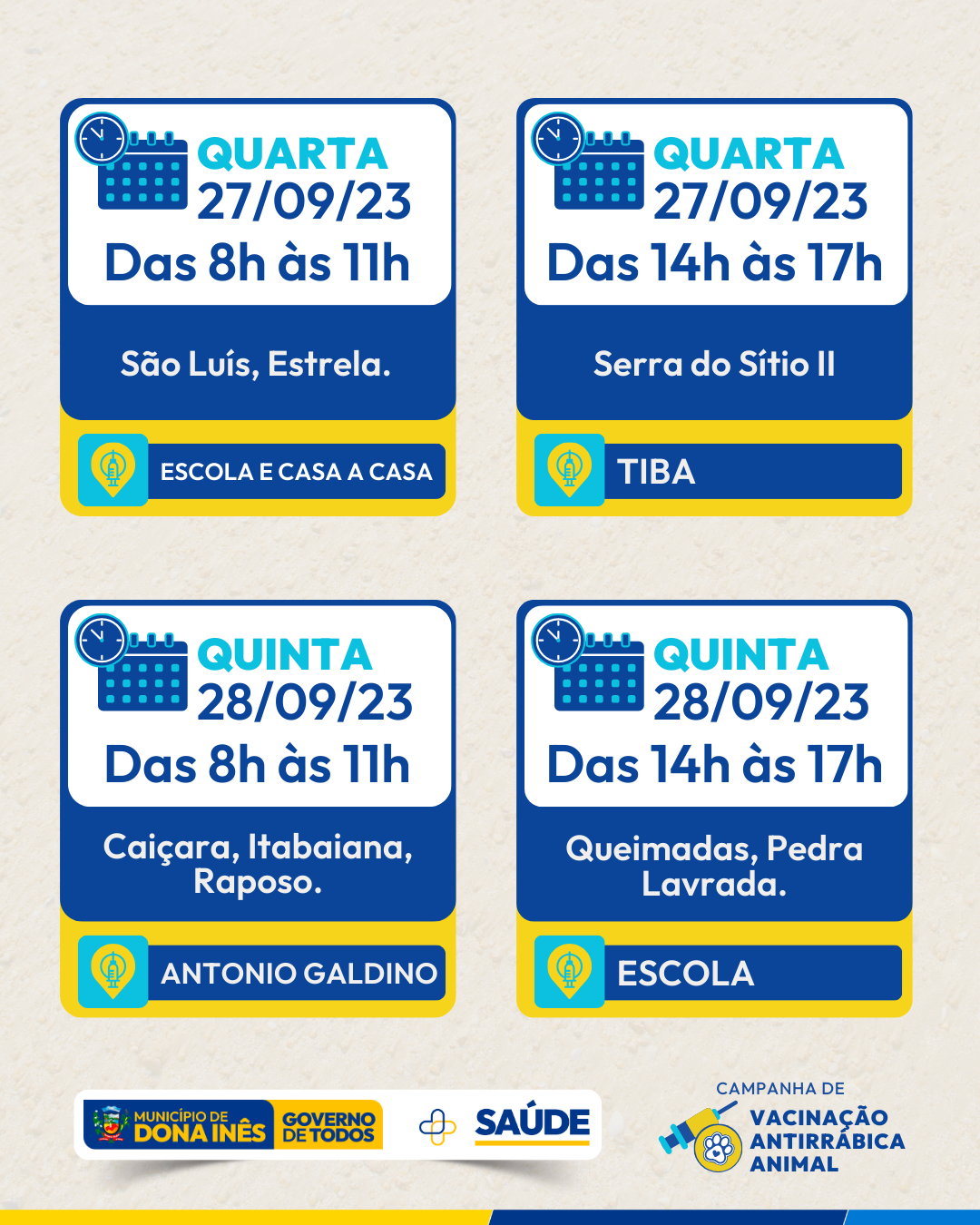 A Gestão Municipal de Dona Inês, através da Secretaria de Saúde, segue com a campanha de vacinação antirrábica. Você da zona rural, confira os locais e horários de vacinação! Todos os cães e gatos devem ser vacinados. Arraste para o lado!